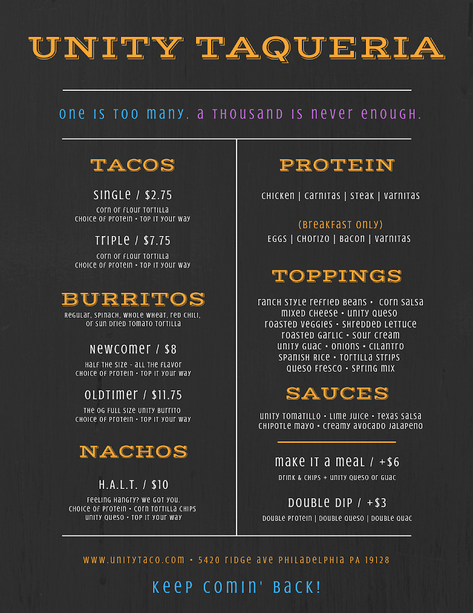 Nestled in the heart of Philadelphia, Unity Taqueria stands as a beacon for taco enthusiasts and health-conscious diners alike. Their menu is a delightful celebration of flavor, featuring a wide array of tacos crafted with fresh, quality ingredients. Each dish offers the option for vegan cheese and gluten-free corn tortillas, making it accessible for diverse dietary needs.